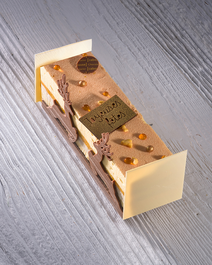 Biscuit Joconde moelleux, croustillant spéculoos, crémeux caramel à la fleur de sel, compote de pommes fraiches et mousse légère à la cannelle.