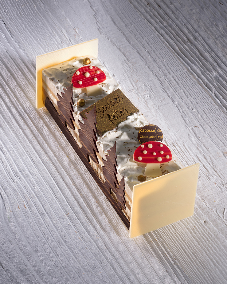 Biscuit fondant à l’amande et aux épices de Noël, croustillant pistache, crémeux marron et brisures de marron confit, crémeux fruits rouges et compotée de cassis, mousse marron-vanille onctueuse.