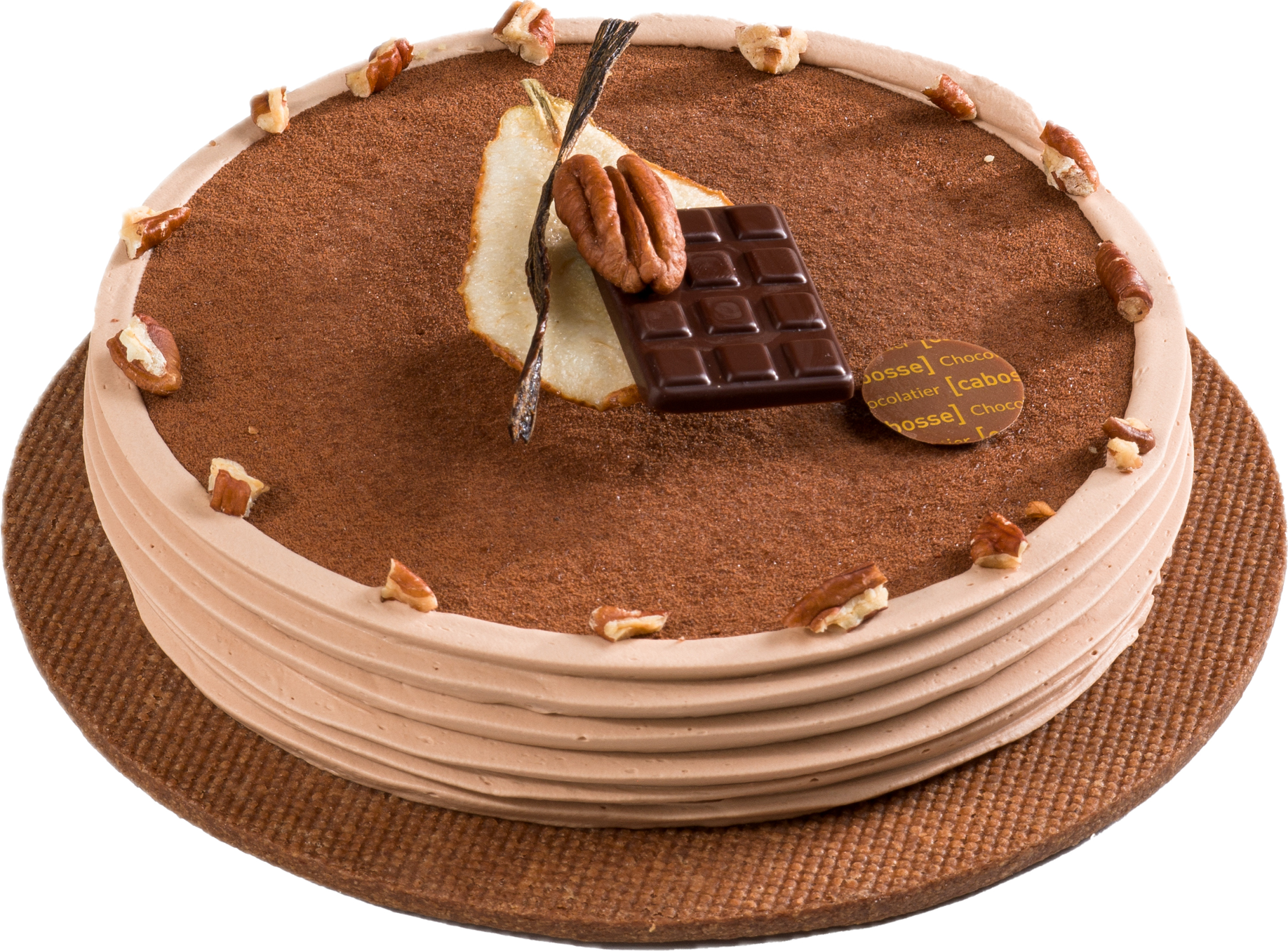 Sablé chocolat, ganache chocolat, poires pochées à la vanille, chantilly pécan.
